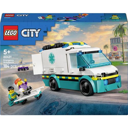 Met de LEGO City Ambulance (60451) kunnen kinderen vanaf 5 jaar spannende reddingsmissies met vol actie naspelen. De ambulance is voorzien van realistische kenmerken, waaronder zijkanten die omhoog kunnen klappen en achterdeuren die open kunnen voor gemakkelijke toegang tot de brancard en medische apparatuur zoals een speelgoedspuit, verband en dokterstas. Daarnaast bevat de set ook een skateboard, een skatehelling en minifiguren van een skateboarder en een verpleegkundige voor eindeloze speelplezier.