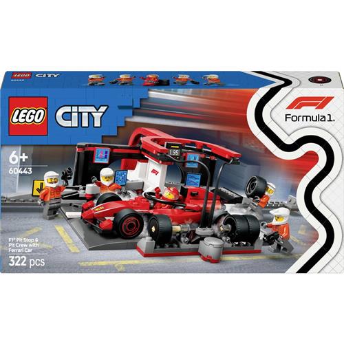 Laat kinderen van 6 jaar en ouder de spanning van het circuit van dichtbij ervaren met de LEGO® City F1® pitstop en pitcrew met Ferrari auto (60443) bouw- en speelset. Deze set bevat alles wat kinderen nodig hebben voor razendsnelle pitstops, inclusief gladde banden, wielpistolen en een team dat met een druk op de knop in positie komt om supersnel de banden te wisselen. Deze speelset bevat een Formule 1® Ferrari speelgoedauto, plus minifiguren van een coureur en 4 monteurs en is afgestemd op jonge raceliefhebbers. Dit LEGO F1 model bevat een stapsgewijze gedrukte bouwgids en digitale instructies in de LEGO Builder app.
