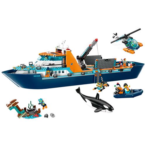 Er wachten je leuke avonturen aan boord van het machtige LEGO City Poolonderzoeksschip (60368). Deze enorme drijvende speelgoedboot zit boordevol realistische details voor fantasierijke ontdekkingsreizen. De hoogwaardige speelset bevat ook een helikopter, een rubberbootje, een onderwaterrobot en een Vikingscheepswrak, plus een schatkist, 7 minifiguren en een figuur van een orka.