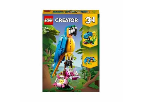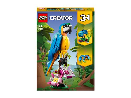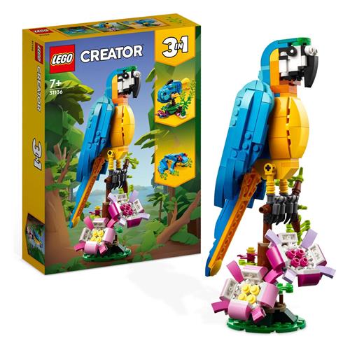 Kleine bouwers en gepassioneerde dierenliefhebbers van 7 jaar en ouder kunnen diep het regenwoud in trekken voor verhalen boordevol actie met deze LEGO Creator 3in1 Exotische papegaai (31136) bouwspeelgoed set. De set bevat een kleurrijke speelgoed papegaai die zijn lichaam volledig kan draaien, terwijl hij op een boomtak zit en zijn vleugels en staart beweegt en tal van andere jungle dieren figuren, zoals een speelgoed kikker. De set bevat 253 onderdelen en kinderen kunnen 3 verschillende exotische speelgoed dierfiguren bouwen: een papegaai op een boomtak, een kikker en een vis.