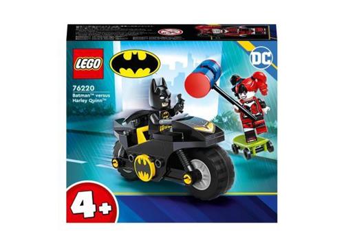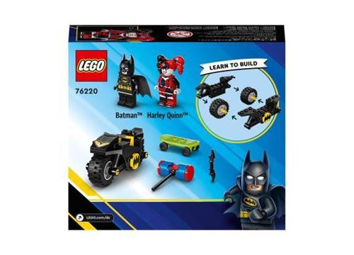 De LEGO DC Batman versus Harley Quinn (76220) set bevat klassieke personages, coole voertuigen en geweldige accessoires, waarmee kinderen samen spelenderwijs leren. Deze speelset met een heleboel actie op wielen bevat 2 populaire personages uit de DC superheldenfilms: Batman op zijn indrukwekkende Batcycle en Harley Quinn op haar skateboard, met een reusachtige hamer in haar hand. Elk zakje in de doos bevat de stenen voor een compleet model en personage dat kinderen in elkaar kunnen zetten, zodat ze gelijk kunnen gaan spelen. Er is ook een grote startsteen voor de motor om ze op weg te helpen. Geschikt voor kinderen vanaf 4 jaar. Met 42 onderdelen en intuïtieve instructies in de vorm van een kleurrijk stripverhaal is dit een speelset boordevol actie op wielen.