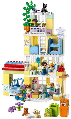 Het LEGO DUPLO Town 3in1 Familiehuis poppenhuis speelgoed voor peuters heeft 3 verdiepingen en bevat 5 kamers, 7 figuren en veel accessoires voor eindeloos speelplezier. Peuters kunnen met de DUPLO stenen één groot poppenhuis met 3 verdiepingen, een hoog gebouw of 2 kleinere woningen bouwen. De set is voorzien van 7 DUPLO figuren en speelgoed kat en hond DUPLO dierenfiguren waarmee kinderen hun creativiteit de vrije loop kunnen laten gaan.