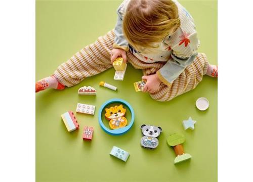 Kinderen vanaf 18 maanden kunnen met de LEGO DUPLO Mijn eerste Puppy en Kitten met geluid (10977) speelgoed voor kleine kinderen veel plezier hebben bij het leren en bouwen. Met de schattige... Luisteren en leren met schattige dieren. Deze lieve dierenspeelset bevat een schattig katje en een puppy, die elk bestaan uit 2 peutervriendelijke onderdelen. Jouw kleine dierenvriend zal het geweldig vinden om een dier in de rollende speelgoedring te plaatsen. En met de geluidsfunctie voor elk dier worden de leerzame speelmogelijkheden nog groter. De geluiden geven aan wanneer de huisdieren willen eten, slapen, spelen enzovoorts – een leuke manier om peuters van alles te leren over het dagelijks leven.