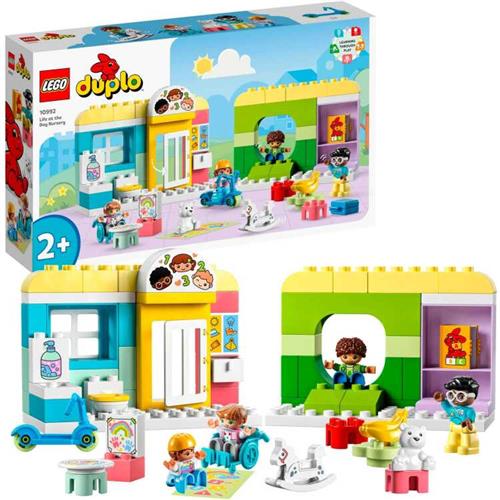 Peuters van 2 jaar en ouder leren spelenderwijs met de LEGO® DUPLO® Stad Het leven in het kinderdagverblijf (10992) set. Met deze educatieve speelgoedset kunnen kinderen dagelijkse gewoontes naspelen terwijl ze leren over cijfers en kleuren. Boordevol realistische details De set zit vol creatieve activiteiten waarmee ouders en kinderen sociale speelscenario's kunnen naspelen, net als in een echt kinderdagverblijf. Kinderen kunnen vingerverven of genieten van een gezonde snack. De rolstoelgebruiker kan de helling af gaan om zich bij de andere kinderen te voegen die op de step door de tuin zoeven. Ouders kunnen ook het belang van handen wassen aanleren in het toilet met wastafel.