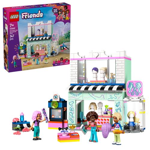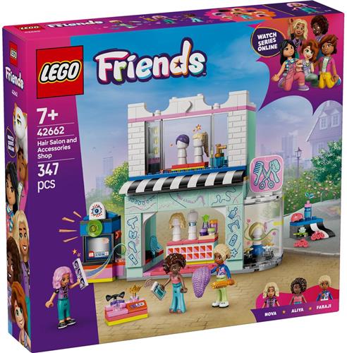 Met het LEGO Friends Kapsalon en accessoirewinkel (42662) bouwpakket kunnen kinderen van 7 jaar en ouder urenlang creatief spelen. De set bevat 3 LEGO Friends poppetjes en diverse haaraccessoires voor fantasierijke rollenspellen. Laat je meeslepen in het verhaal van Nova en Aliya terwijl ze samen met haarstylist Faraji nieuwe kapsels creëren en genieten van een dag vol plezier in dit 2 verdiepingen tellende gebouw. Bovenaan vind je het kapsalon met stoelen, haardrogers en pruiken voor de personages, terwijl beneden de accessoirewinkel te vinden is met nog meer pruiken en leuke accessoires. Laat de personages grappige foto's maken in het fotohokje en ontdek de draaibare etalage met een kleine skatebaan voor extra speelplezier.