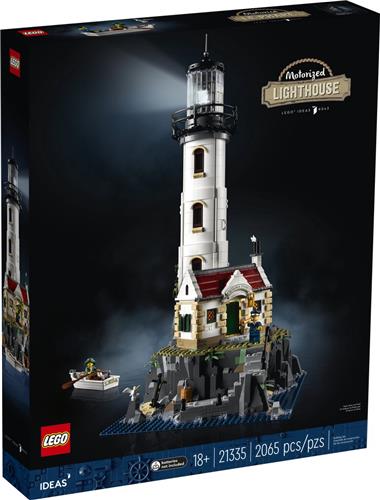 Deze bouwbare LEGO® Ideas Gemotoriseerde vuurtoren (21335) set bestaat uit een vuurtoren met een gemotoriseerd ronddraaiend licht en speciaal ontworpen fresnellens-element, plus een huisje met een gloeiende open haard. De vuurtoren en het huisje zijn eenvoudig toegankelijk om alle details te bekijken. Ze staan boven op rotsen van LEGO stenen met een trap naar een steiger en een grot met daarin een piratenschat. Met minifiguren van een vuurtorenwachter en zeiler, plus een bouwbare roeiboot en figuren van een zeemeeuw en kat.
