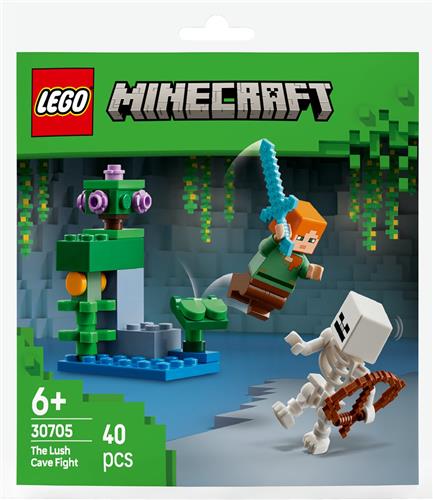 Stap in de LEGO Minecraft wereld met de set 30705 - Duel bij de weelderige grot (polybag)! Alex staat klaar met haar diamanten zwaard om het op te nemen tegen een angstaanjagend skelet dat gewapend is met een boog. De strijd vindt plaats in een prachtige grot, omringd door klei, mos, bloemen, ranken, gloeiende bessen en een groot uitvouwbaar druppelblad.