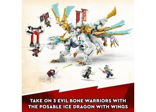 Het LEGO Ninjago Zane ijsdraak (71786) speelgoed voor kinderen vanaf 10 jaar is volledig gevuld met was Dit NINJAGO 2-in-1 model kan worden gebouwd tot een bewegende ijsdraak met 6 poten, een lange staart, hoorns en vleugels met gouden zwaarden en daarna worden omgebouwd tot een verstelbare drakenstrijder die op 2 benen staat en een groot gouden zwaard in zijn handen heeft.