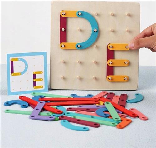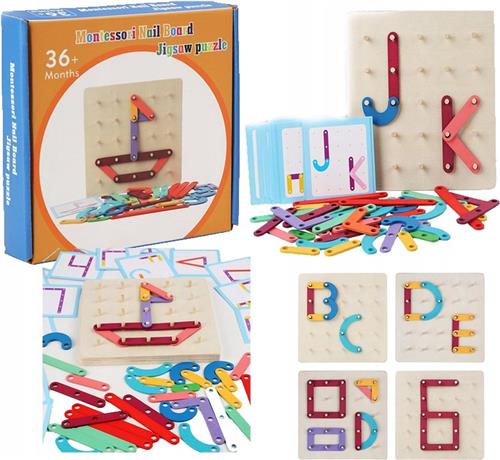 Het kind heeft de mogelijkheid om precisie en motorische coördinatie te oefenen door de blokken op het bord met inzetstukken te plaatsen. Zo verbetert het kind zijn manuele vaardigheden en leert het vormen, kleuren en maten herkennen. Kinderen kunnen alleen, met vrienden of ouders spelen. Dit speelgoed is ontworpen om de manuele en cognitieve ontwikkeling van kinderen te ondersteunen, volgens de Montessori-methode. Met deze set laat u uw kleuter kennismaken met de wereld van letters en cijfers, vanaf de leeftijd van 3 jaar. Set bevat: - 20 dubbelzijdige speelkaarten - 43 opleggers (in 9 vormen en 11 kleuren) - 1 prikbord