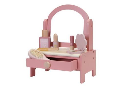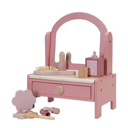 Met de Little Dutch kaptafel kunnen kinderen zich urenlang optutten voor de spiegel. De roze kaptafel van 33 cm hoog stimuleert de fantasie van kinderen vanaf 3 jaar. Het rollenspel speelgoed bevat 6 accessoires, waaronder een houten haarborstel, lippenstift, parfum, oogschaduw, nagelvijl en nagellak. In de opberglade kunnen kinderen hun eigen haaraccessoires bewaren, zoals elastiekjes, haarbanden en speldjes (niet inbegrepen). Gemaakt van FSC-hout met verf op waterbasis, garandeert deze kaptafel veilig en duurzaam speelplezier.