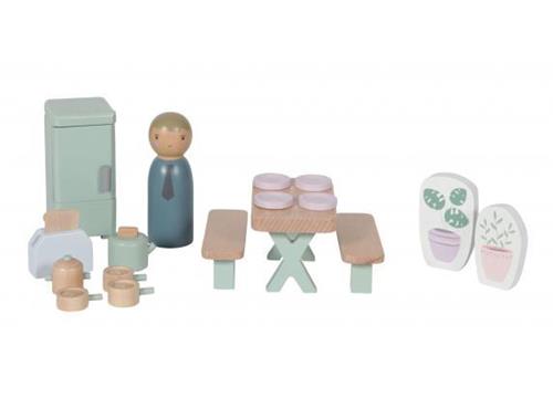 Met de Little Dutch Aanvulset Poppenhuis - Keuken kunnen kinderen de keuken van hun poppenhuis inrichten met leuke meubels en schattige accessoires. Deze uitbreidingsset bevat onder andere een vader pop, een tafel, 2 bankjes, een koelkast, een broodrooster met toast, een theepot, 4 borden, 4 pannen, 2 planten en een stickervel. Alles wat nodig is om de keuken compleet te maken en eindeloos speelplezier te beleven.