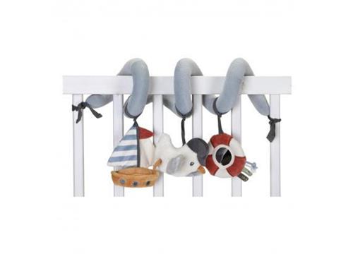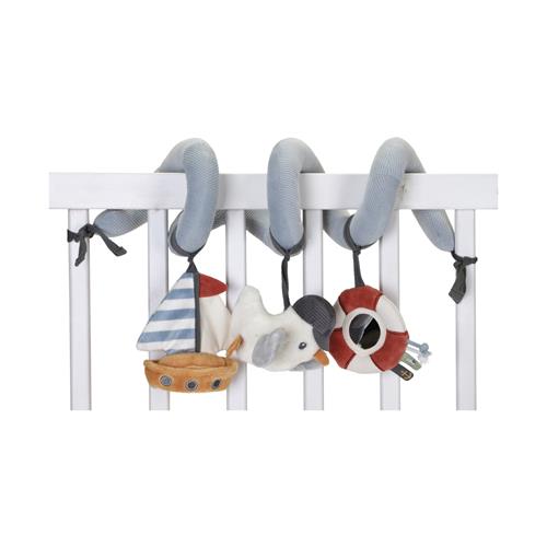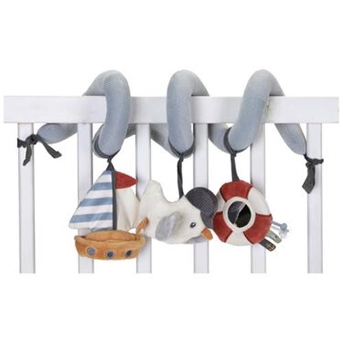 Ahoy, kleine matroos! Elke dag wordt een nieuw avontuur in de baai met deze uitnodigende activiteitenspiraal. Dit uitdagende speelgoed is gemaakt van katoen en corduroy en heeft verschillende speeltjes, waaronder een zeemeeuw, een zeilboot en een reddingsboei met verschillende leuke labels en een spiegeltje voor zelfontdekking. De spiraal stimuleert de eerste hand-oogcoördinatie van je kleintje en zorgt voor urenlang vermaak. Je kunt hem gemakkelijk bevestigen aan de box, een autostoeltje of kinderwagen. Vanaf de geboorte. Wasbaar op 30 graden in de wasmachine.