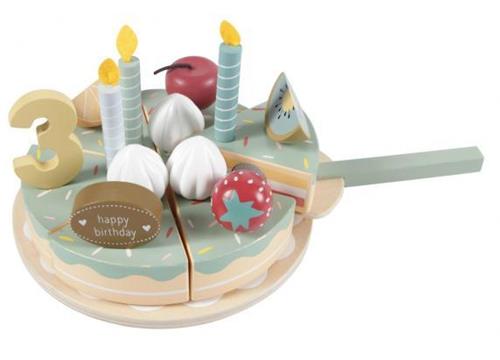 De verjaardagstaart is gemaakt van hout en heeft een vrolijke groene kleur. Dit duurzame materiaal zorgt ervoor dat kinderen veilig kunnen spelen en de taart gemakkelijk kunnen schoonmaken na het spelen. Met de realistische details en kleurrijke versieringen zullen kinderen urenlang genieten van dit speelgoed.