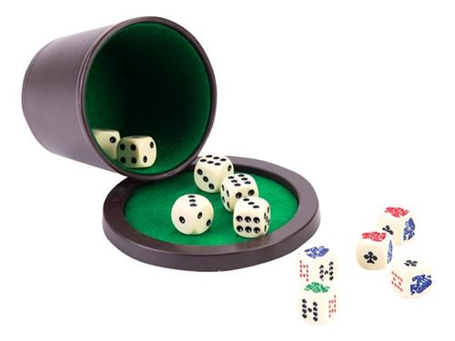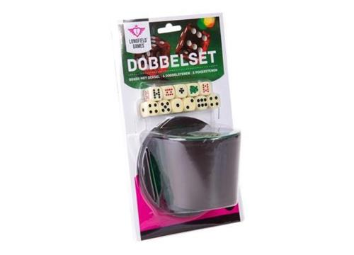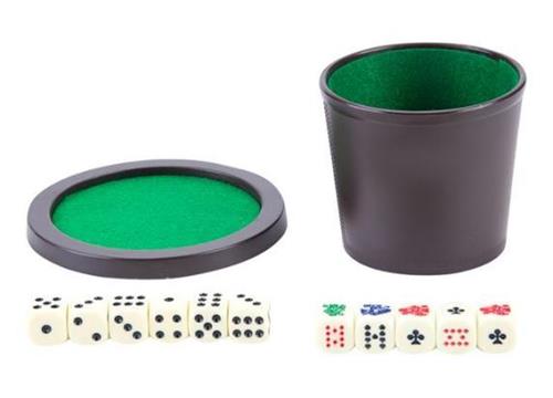 | Verpakkingsinhoud | Leuke dobbelset met 5 pokerstenen, 6 dobbelstenen en een dobbelbeker met deksel. |