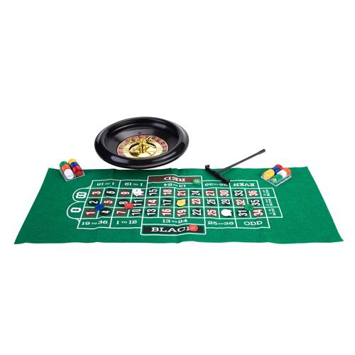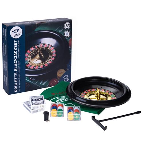 | Verpakkingsinhoud | Roulette en black jack set. Amerikaanse versie (0 en 00) met tweezijdig kleed voor roulette en black jack. De set bevat ook fishes, kaarten en een croupierhark. |
