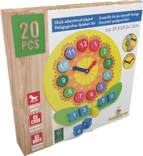 Met dit prachtige houten klok speelgoed kunnen kinderen op een speelse manier leren klokkijken. De marionette set is niet alleen educatief verantwoord, maar ook ontzettend leuk om mee te spelen. De klok is gemaakt van hoogwaardig hout en bevat kleurrijke cijfers, waardoor het leren klokkijken een feestje wordt.