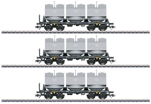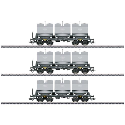 Ontdek de Märklin 48263 H0 kalkkubelset Slmmp van de Deutsche Reichsbahn (DR). Deze unieke set bestaat uit drie vierassige kalkkuipwagens, ideaal voor het transport van natgevoelig stortgoed. Met hun zwarte landingsgestel en lichtgrijze kuipen brengen deze wagens een authentieke uitstraling aan jouw modelspoor. Ze zijn ontworpen voor gebruik in tijdperk IV en bieden een blik op de industriële geschiedenis van de DDR.