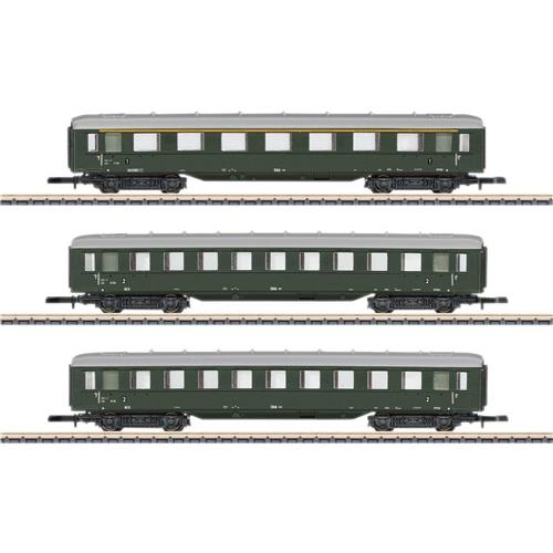 Ontdek de Märklin 87107 Z 3-delige set zijwagens van de Oostenrijkse Spoorwegen (ÖBB). Deze unieke set bestaat uit drie stijlvolle sneltreinwagons, uitgevoerd in een verfijnde donkergroene kleurstelling. Een wagon vertegenwoordigt de eersteklas, terwijl de andere twee wagons ideaal zijn voor de tweedeklas passagiers. Deze combinatie maakt het een perfecte aanvulling voor uw modelspoorbaan.