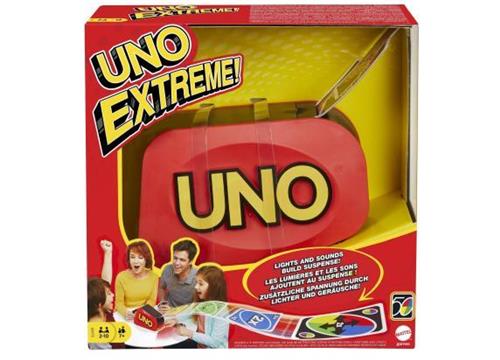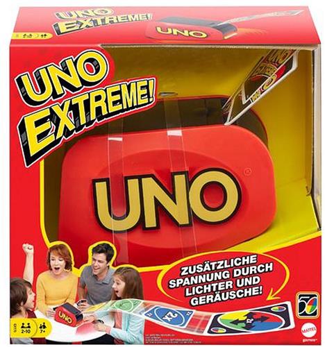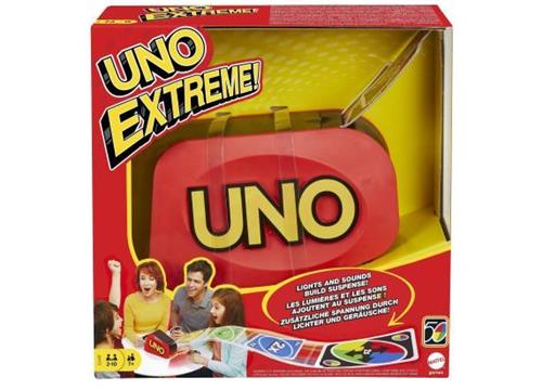 Deze editie van UNO® Extreme heeft een vernieuwde kaartlanceerder met een slank ontwerp dat kaarten hoog in de lucht schiet. Coole lichten en geluidseffecten knipperen steeds sneller als de knop wordt ingedrukt, wat de spanning nog verder doet stijgen. De anticipatie die je voelt tijdens het wachten tot de kaarten worden gelanceerd is bijna ondraaglijk! Stapel de kaarten in de lanceerder en speel vervolgens ieders favoriete kaartspel. Als de Dat-is-vervelend-kaart tevoorschijn komt, kijk dan uit! Als spelers nog maar één kaart over hebben, moeten ze nog steeds 'UNO!' roepen Afwijkende kleuren en versieringen mogelijk.