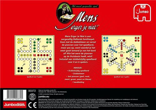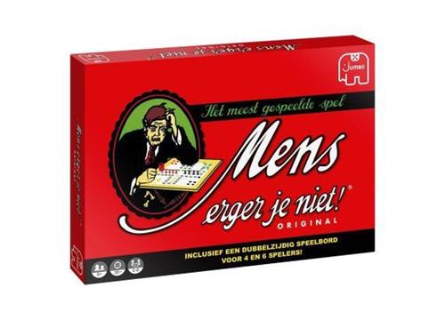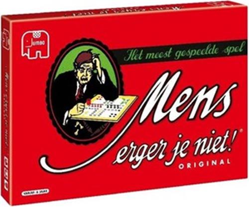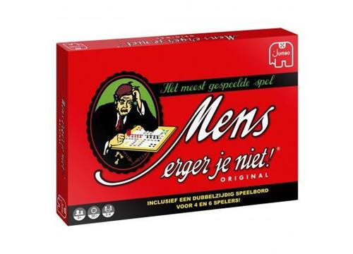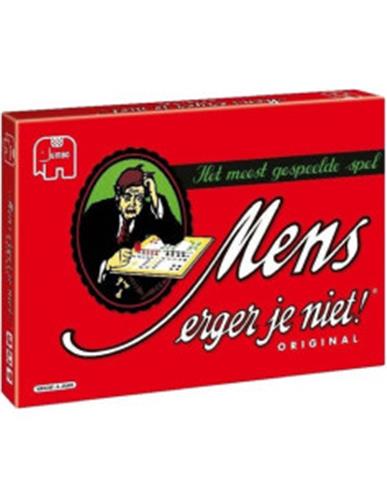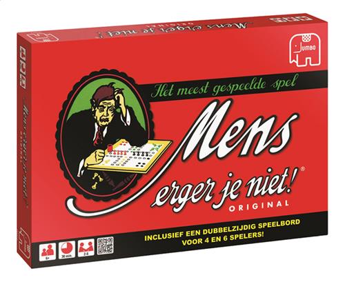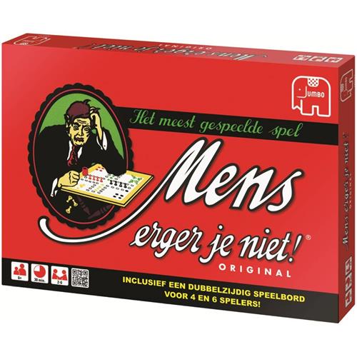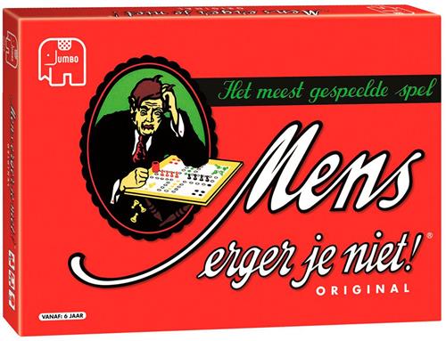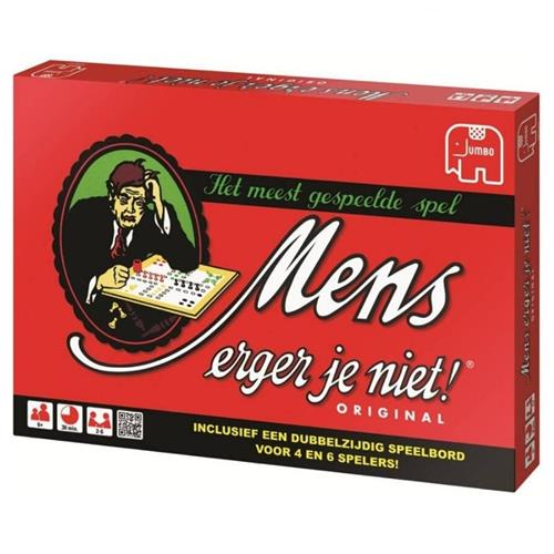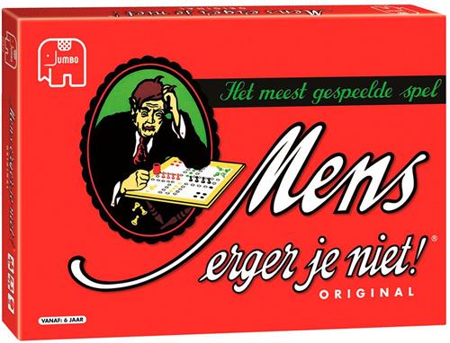 De originele uitvoering van dit meest gespeelde spel. Wie kent het niet? Dé manier om regenachtige zondagmiddagen door te komen, al is Mens Erger Je Niet eigenlijk altijd een vermakelijk spel. 2 tot 6 spelers, vanaf 6 jaar. Jumbo mens erger je niet is ongetwijfeld het meest bekende en gespeelde bordspel ooit. Dobbel naar de eindstreep en schakel je tegenstanders uit. Maar pas op, voor je het weet ben je zelf het haasje!