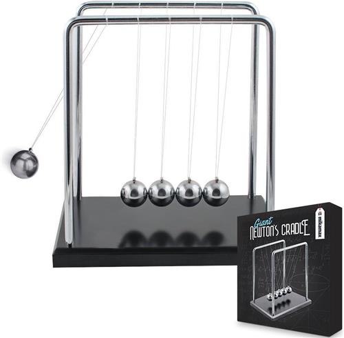 Deze Deluxe versie van de Newton's Cradle heeft een houten voet en een frame van metaal. Laat de wet van de zwaartekracht op je inspelen voor opperste concentratie tijdens werk. Luxe houten voet en een frame van metaal. De MikaMax Newton Cradle XL is een super gaaf item voor elk bureau. De Newton's Cradle geeft goed weer hoe kinetische krachten en momentum behouden kunnen worden, dit is niet alleen erg interessant, het ziet er ook nog eens super leuk uit! Dit heeft te maken met de derde wet van Newton. De Newton Pendel zorgt ervoor dat elk balletje wat verplaatst wordt de energie doorgeeft aan het volgende balletje, dit wordt steeds doorgegeven tot het laatste balletje. De laatste bal schiet omhoog en zal uiteindelijk weer de energie doorgeven aan de volgende bal. Dit zorgt voor een eindeloze loop, waar je uren naar kan kijken. Deze Newton's Cradle onderscheidt zich van de rest, hij wordt namelijk geleverd met houten voet én metalen frame. De Newton Cradle XL is een leuk cadeau voor iedereen die houdt van leuke, aparte, wetenschappelijke of gewoon weg fascinerende gadgets. Zo staat een Newton Cradle super op een bureau, maar is het ook geschikt voor op tafel of in een vitrinekast. Raak gefascineerd en kom tot rust door de constante beweging van de ballen. Redenen om te kiezen voor de Newton Cradle XL: Groter dan de meeste modellen, wordt geleverd met houten voet én metalen frame, raak urenlang gefascineerd en kom tot rust, super leuk en uniek cadeau. Dus ben jij toe aan iets leuks of fascinerends op je bureau of thuis? Bestel de Newton's cradle dan snel en beleef uren kijkplezier.