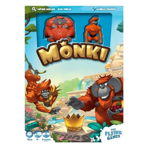 Diep in de jungle, is het tijd voor de opvolging! Twee orang-oetans van de Monki-stam vechten een hebzuchtig duel uit om de kroon die de koning zal bepalen. Omringd door oude standbeelden, in de ruïnes van een tijdloze tempel, staan vreemde kruiken met begeerde vruchten. Ben jij slim genoeg om de koning van de Monki-stam te worden? Gulzig zijn kan je duur komen te staan! Neem risico's om zoveel mogelijk vruchten te verzamelen en kijk uit, want bij 2 dezelfde vruchten is je beurt voorbij. Verzamel de juiste vruchten en word koning van de Monki-stam! Monki is een spel voor twee spelers waarin je je geluk zo ver mogelijk inzet om alle verschillende soorten fruit in de tempel te verzamelen, vooral de gouden vruchten! Tijdens je beurt verplaats je je Monki-beeldje in een rechte lijn, dan kun je fruitfiches eromheen verzamelen totdat je stopt of je een duplicaat onthult (en je bust). Het spel eindigt wanneer een speler alle acht gewone vruchten - of vier gouden vruchten - verzamelt en daarmee direct wint.