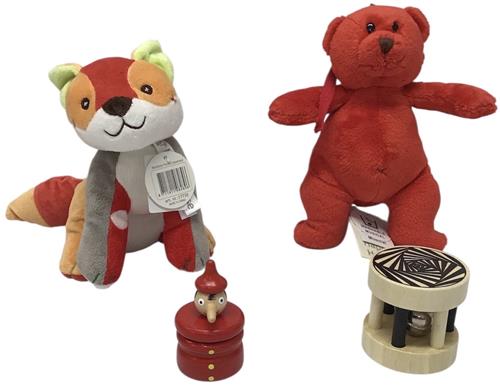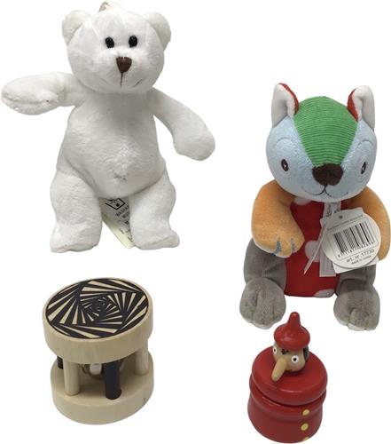 | Verpakkingsinhoud | 1 x muziekdoos Beer lengte 20 cm 1 x pluche knuffel jungle hoogte 17 cm 1 x tandendoosje Pinokkio hoogte 7 cm 1 x baby rammelaar hoogte 6 cm |