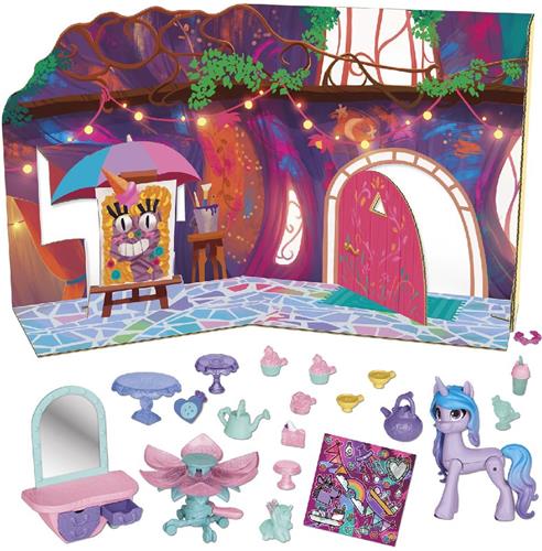| Verpakkingsinhoud | Inhoud: figuur, verhaalscène, stickervel, bloemtafel, kaptafel, cutie mark-amulet en 15 accessoires. |