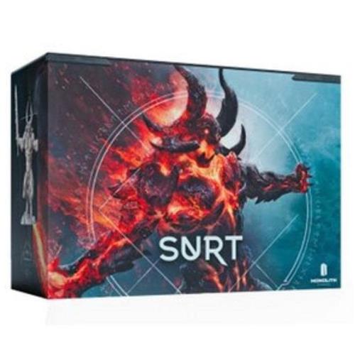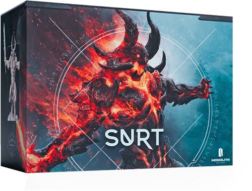 De Mythic Battles: Ragnarök Surt-uitbreiding bevat: 1 titaan-groot miniature, 1 titaan-dashboard, 5 activatiekaarten, 2 3D-brandende tokens en 2 avontuurmodus-scenario's.