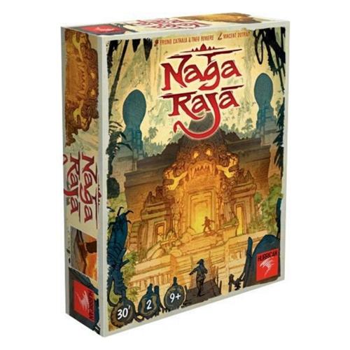Naga Raja is een bordspel uitgegeven door Hurrican Games. In dit 2-speler spel verplaatst elke speler zich door zijn eigen tempel, waarin zich velden voor kamertegels bevinden met daaromheen 9 bergplaatsen met heilige en vervloekte relikwieën. Deze relikwieën zijn overwinningspunten waard. Het spel wordt gespeeld in een aantal rondes. Per ronde proberen de spelers een kamertegel te claimen, om zo een route naar de relikwieën te maken, door het uitspelen van kaarten en het werpen van speciale dobbelstaafjes. Op deze dobbelstaafjes staan lot-punten of Naga symbolen. De speler met de meerderheid van lot-punten claimt de tegel, of kan met Naga symbolen speciale actie kaarten uitspelen. Deze actie kaarten geven de spelers de mogelijkheid om de tempel route, relikwieën of gebruikte dobbelstaafjes te manipuleren. Het spel eindigt direct wanneer aan een van de eindvoorwaarden is voldaan: Een van de spelers die zijn derde vervloekte relikwie omdraait, verliest direct. Een van de spelers bereikt een totaal van 25 punten. Een van de spelers plaatst de negende kamertegel in zijn tempel. Het is een strategisch spel dat in ongeveer 30 minuten gespeeld kan worden.