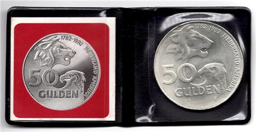 Dit vijftigguldenstuk is een munt van het Koninkrijk der Nederlanden. Uitgegeven ter herdenking van de gedurende 200 jaar ononderbroken diplomatieke relatie tussen Nederland en de VS, 1782-1982, werd deze munt geslagen naar een ontwerp van de beeldhouwer en medailleur Eric Claus uit Amsterdam. De munt heeft een nominale waarde van 50 gulden, een diameter van 38 mm en een gewicht van 25 gram. Het zilvergehalte is 925/1000 en de kwaliteit is Uncirculated. In totaal zijn er 200.000 munten geslagen. De munt wordt geleverd in de originele verpakking uit 1982, in een zwart mapje, met certificaat. Zowel de munt als de verpakking kunnen lichte verouderingssporen vertonen.
