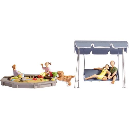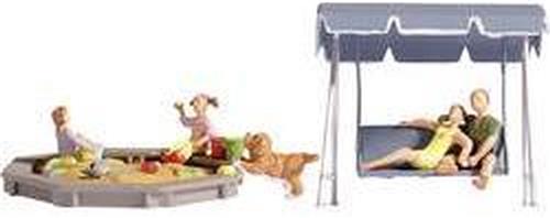 Twee ouders, 2 kinderen en een hond staan vrolijk beschilderd in de achtertuin. De scène toont hen die genieten van de schommelbank en zandbak. Dit gedetailleerde model op schaal H0 is perfect voor volwassen verzamelaars.