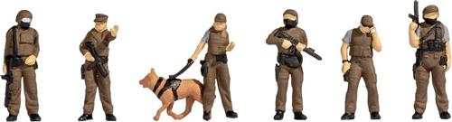 In deze set zie je drie politieagenten die de wacht houden met hun geweren in de hand, terwijl een vierde politieagent aan de telefoon overlegt met de meldkamer. Een andere politieagent strekt zijn hand waarschuwend uit. De speurhond van de politieagente lijkt in de speurmodus te zitten en volgt een geurspoor op. Dit geeft een realistische touch aan je modelspoorbaan in schaal 0.