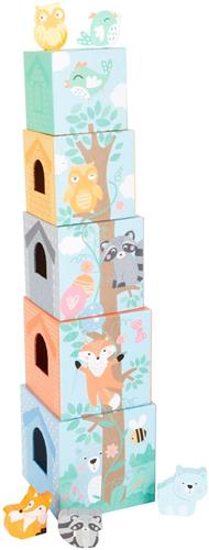 Ontdek uren speelplezier met deze pastelkleurige stapeltoren met dieren van Small Foot! Speciaal ontworpen voor kinderen vanaf 1 jaar, biedt deze set vijf stabiele kartonnen kubussen en bijpassende houten dierfiguren om te sorteren en stapelen. Met de deur- en raamopeningen in vier van de kubussen kunnen de figuren verstopt worden, wat zorgt voor extra spannende speelmogelijkheden.
