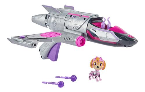 Gekleed in haar roze PAW Patrol The Mighty Movie-uniform, met doorschijnende secties en een stoere helm, klik je je Skye-actiefiguur vast in de cockpit van haar vliegtuigspeelgoed om meerdere delen van Sky's lichaam en haar straalvliegtuig te verlichten, zie haar poten oplichten, hoor muziek en geluidseffecten. Wanneer het tijd is voor een actievolle reddingsmissie, houd dan de handgreep van Skye's vliegtuig vast en kantel het omhoog, omlaag, naar links en naar rechts om geluidseffecten te activeren. Knijp vervolgens in de hendel op de handgreep om een barrel-roll-beweging van de vleugels van haar straaljager te lanceren en meer geluidseffecten te horen terwijl je van de ene missie naar de andere schiet.