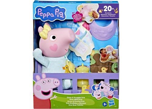 Maak kennis met de schattige Peppa Pig Oinks & Snuggles Interactieve Babypop Evie! Dit nieuwe babyzusje van Peppa brengt een wereld van speelplezier met zich mee. Kinderen vanaf 3 jaar kunnen hun favoriete momenten uit de populaire serie naspelen en eindeloos knuffelen met de interactieve babypop. Met meer dan 20 verschillende geluidjes komt Evie echt tot leven, waardoor het verzorgen van haar een unieke ervaring wordt.