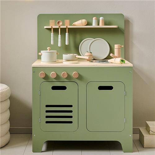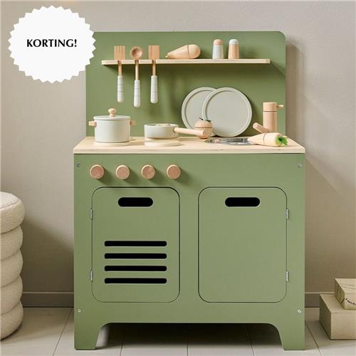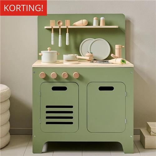 Meesterkok in de dop! Wil je kind altijd meehelpen in de keuken? Met deze olijfgroene houten speelkeuken wordt je kind zelf een meesterkok. Het perfecte cadeau voor kinderen vanaf 3 jaar. De speelgoed keuken is stevig, robuust en belooft jarenlang plezier. De kinderkeuken wordt geleverd met een licht grijze 13-delige houten keukenset.