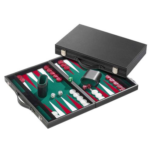 Philos Medium backgammon koffer, kunstleer met groene inleg, compleet met speel- en dobbelstenen. 380x235x55 mm Speeltijd minimaal: 10 minuten Speeltijd maximaal: 40 minuten Aantal spelers minimaal: 2 Aantal spelers maximaal: 2 Leeftijd vanaf: 6 Lengte: 545 mm Breedte: 245 mm Hoogte: 63 mm Materiaal: hout, kunststof