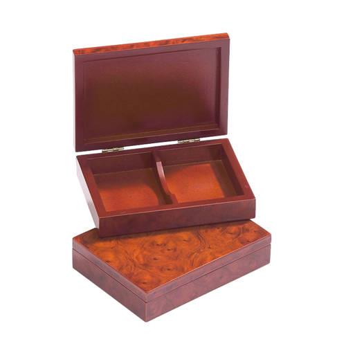 Met deze mooie houten opbergbox blijven je speelkaarten altijd netjes en raak je ze niet kwijt! De Philos Box voor Speelkaarten (zonder inhoud) heeft een wortelhouten design en afmetingen van 153 x 112 x 35 mm. De verpakkingsgewicht is 0.24 kg.