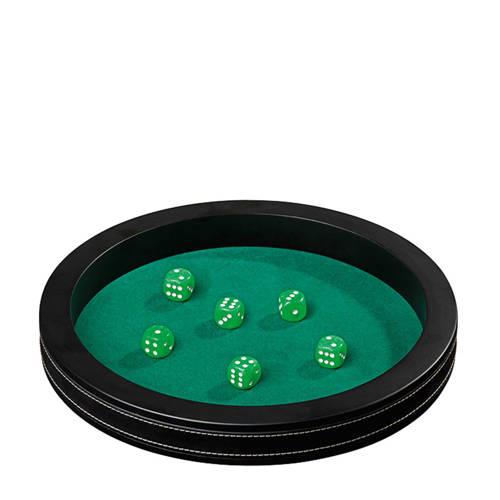 De Philos dobbelpiste kunstleren rand heeft een diameter van 40 cm en een rand van 36 mm hoog. De bak is bekleed met synthetisch leer en vilt, wat zorgt voor een luxe uitstraling. Daarnaast wordt de dobbelpiste geleverd met 6 parelmoer dobbelstenen van 15mm.