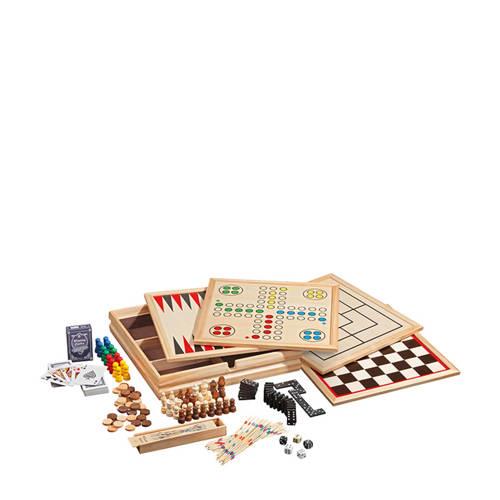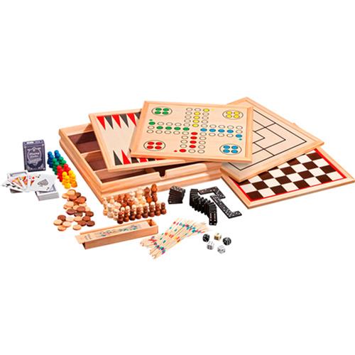 Dit is een houten speelset met verschillende klassieke spellen. Verpakt in een dennen houten box zijn twee dubbelzijdig bedrukte spelborden en alle benodigde toebehoren. Je vindt onder andere schaken, dammen, backgammon, molen spel, dobbelen, domino, 2 decks speelkaarten, mikado en speelstukken & toebehoren in deze set. Let op! Dit spel is niet geschikt voor kinderen onder de 3 jaar vanwege de kleine speelstukken.
