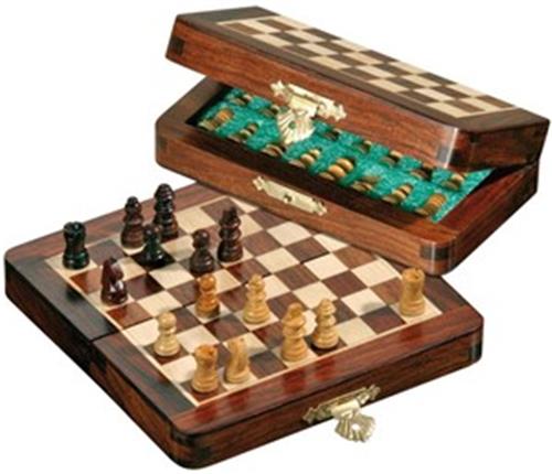 De Philos Reis Schaak Kassette Mini met een veld van 12 mm en een koningshoogte van 20 mm is een prachtige mini schaakset van het bekende spelletjes merk Philos. Gemaakt van sheesham en beukenhout en volgens CITES richtlijnen gecertificeerd. Deze kleine schaakset is magnetisch en daardoor zeer geschikt om mee te nemen op reis.