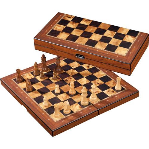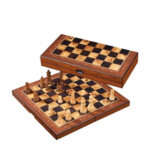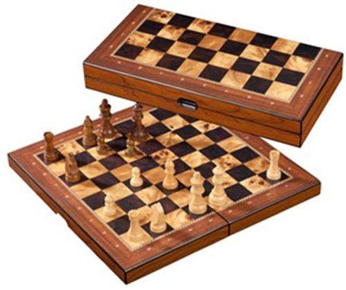 Deze schaakcassette van Philos heeft een opmerkelijke birdseye-maple optiek met ornamentele rand wat de schaakcassette een luxe uitstraling geeft. De schaakstukken zijn gemaakt van Schima hout met een Staunton design. Het speelveld is geprint met cijfers en letters en heeft een veldmaat van 40mm. Schaak kassette, MDF houten met schima houten stukken in Staunton design, verzwaard met viltsokkel. 40 mm veld, 76 mm Koningshoogte, 400 x 200 x 60 mm. Met randbeschrijving en magnetische sluiting.