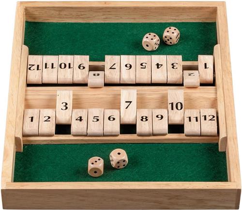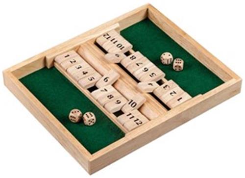 Shut the Box 12, voor 1-2 Spelers. Het spel is heel simpel maar tegelijkertijd zeer onderhoudend voor veel personen. De spelers gooien de dobbelstenen en proberen een of meer klepjes te sluiten tot het totaal van met de dobbelstenen gegooide aantal. De winnaar is degene met de laagst overgebleven waarde. Daarnaast heeft het spel een afmeting van 245x300 mm.