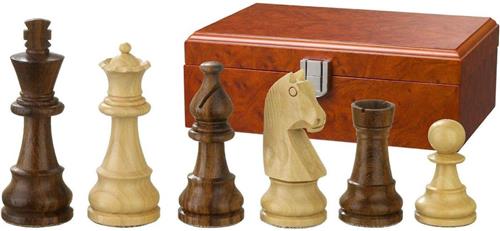 Houten box met set schaakstukken 'Titus', Sheesham en Beuk, met kunstlederen sokkel, Staunton. Koningshoogte 83 mm.