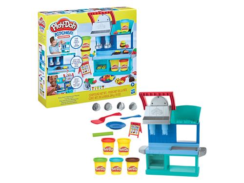 Met de Play-Doh Kitchen Creations Busy Chef's Restaurant-speelset kunnen kinderen hun eigen restaurant runnen en creatief spelen met Play-Doh. Deze set biedt eindeloze mogelijkheden voor het maken, aanpassen en delen van Play-Doh-gerechten met denkbeeldige klanten. Met deze keuken speelset kunnen kleine hobbykoks zich voelen alsof ze hun eigen restaurant runnen. Hier creëren en serveren ze de leukste gerechten van Play-Doh. Wanneer 2 stempels worden bevestigd en de hendel wordt ingedrukt, ontstaan er hamburgers, pizza, kip of spaghetti van Play-Doh.
