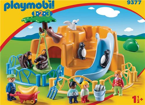 De apenkooi is voorzien van een schommel en rustplaats. Het pinguïnbassin beschikt over een glijbaan. Afmetingen: 35 x 33 x 16 cm (LxBxH). De dierentuin bestaat uit een grote rots die in combinatie met de in totaal zes hek elementen een van elkaar gescheiden verblijf voor apen en pinguïns vormt. In de rots bevinden zich twee van elkaar gescheiden holen die via twee verschillende ingangen toegankelijk zijn. Aan de boom kan de werkende schommel voor een aap bevestigd worden. De kruiwagen kan alleen door een volwassen 1.2.3-figuur geduwd worden (kinderfiguur niet mogelijk vanwege de hoogte).