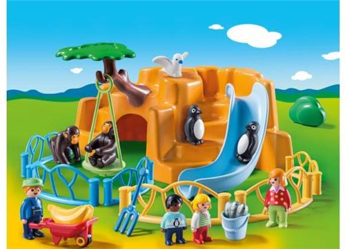 De kinderen kijken al dagen uit naar het bezoek aan het dierenpark. Eindelijk is het zover. De zon schijnt en de twee kleintjes lopen opgewonden naar het eerste verblijf. Daar vermaken de pinguïns zich opperbest bij het klimmen en glijden. In het verblijf daarnaast maken twee apen ruzie om de schommel. "Het lijkt wel een beetje zoals bij ons op de speelplaats,” roept het kleine meisje verwonderd. “Kom, we kijken nog verder,” zegt mama, “het is bijna voedertijd en dat willen we natuurlijk niet missen, of wel?” Met de heldere kleuren en ronde vormen is PLAYMOBIL® 1.2.3 zeer geschikt voor kleine kindjes. De sets zijn zeer robuust en kleurecht en bevatten geen kleine onderdelen die kunnen worden ingeslikt. Afwisselende speel- en leerfuncties zorgen gegarandeerd voor langdurig speelplezier.