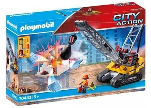 Voordat het nieuwe huis kan worden gebouwd, moet het oude huis eerst worden gesloopt. Hiervoor komt de bouwvakker met zijn wendbare kabelkraan. De kraanmachinist brengt eerst de giek in de juiste positie en laat dan de sloopkogel vallen. De sloopkogel boort zich in de muur van het huis en er breekt meteen een groot stuk uit de muur. In een mum van tijd worden de muren afgebroken. De rest wordt gedaan door de collega met explosieven. Hiervoor plaatst hij de explosieve lading onder de tegelplaten en zoekt hij snel dekking achter de veiligheidsmuur. Boem! Met een knal vallen de muren uit elkaar. Dat was goed werk! De set bestaat uit twee PLAYMOBIL-bouwvakkers, een kabelkraan met sloopkogel, twee wandelementen, een bodemplaat, explosieven, een veiligheidsmuur, vier tegelelementen en vele andere bouwaccessoires.\