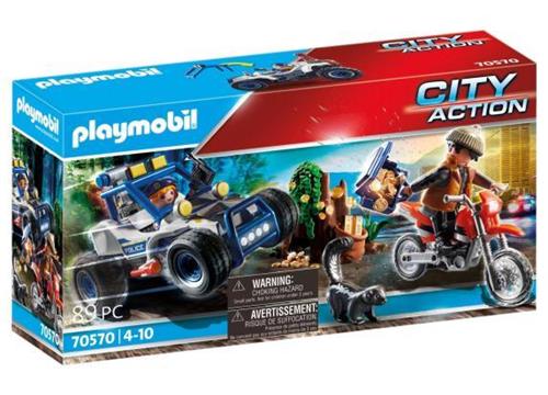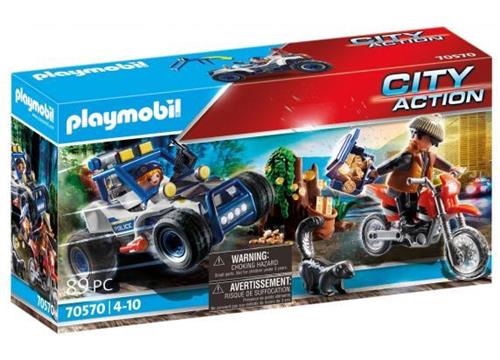 De speelset bevat twee PLAYMOBIL-figuren die de rollen van de dief en de dappere politieagent vertolken. Kinderen kunnen hun verbeelding de vrije loop laten terwijl ze de dief op de motorcrossfiets dwars door het bos zien rijden en de agent hem op de hielen zit met zijn terreinwagen.